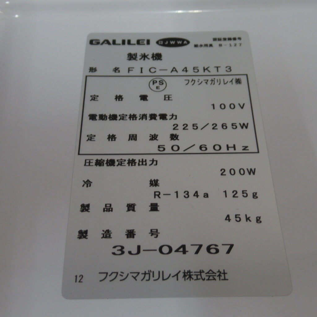 ガリレイ FIC-A45KT3 2023年 製氷機