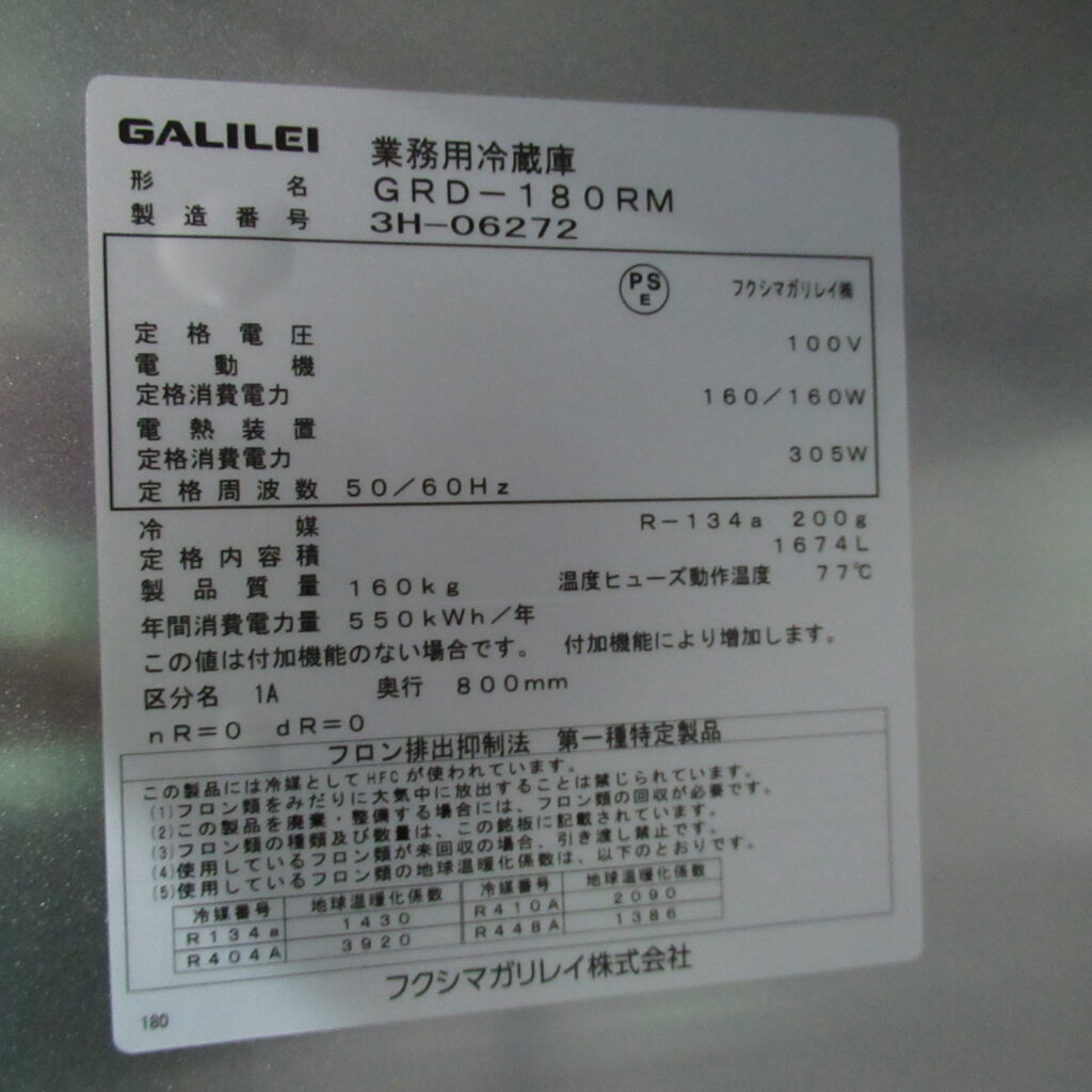 ガリレイ GRD-180RM 2023年 業務用冷蔵庫