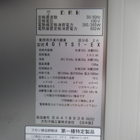 ダイワ 401YS1-EX 2022年 業務用冷凍冷蔵庫