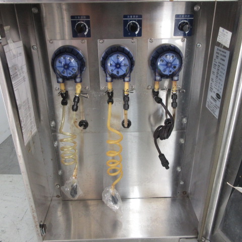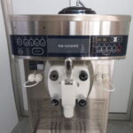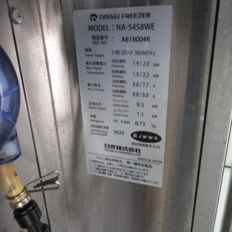 | 特記事項 | ソフトクリームフリーザー(業務用) 消費電力(最大電力) ・Freezing(冷却時):1.9 kW(50Hz)/2.0 kW(60Hz) ・Power Consumption(最大消費電力):1.9 kW(50Hz)/2.2 kW(60Hz) 最大電流(Max. Current) ・Freezing(冷却時):8.0 A(50Hz)/7.7 A(60Hz) ヒーター(Heater) ・容量:1.0 kW 撹拌モーター(Beater Motor) ・容量:0.75 kW 定格出力(Rated Output) ・出力:1.1 kW 冷媒 ・種類:HFC R-404A ・封入量:0.73 kg 冷媒番号(Refrigerant No.) ・GWP(温暖化係数):3920 |