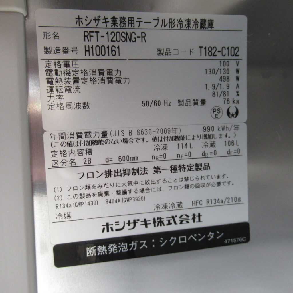 ホシザキ RFT-120SNG-R 冷凍冷蔵