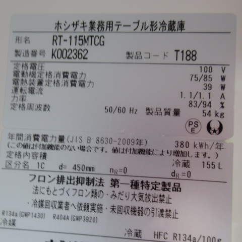 ホシザキ RT-115MTCG 冷蔵
