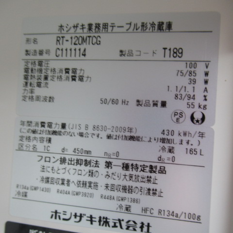 ホシザキ RT-120MTCG 冷蔵